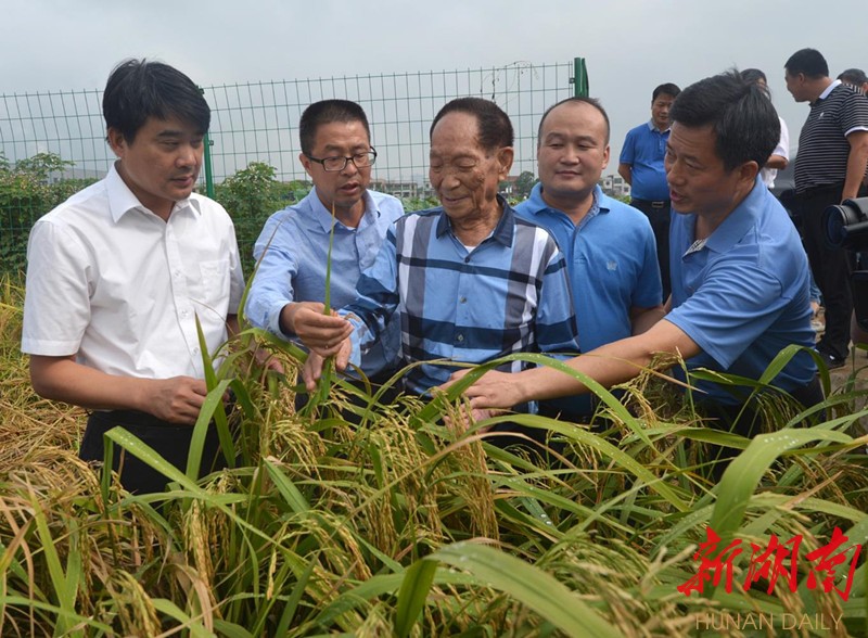 (2017年9月29日上午,袁隆平院士左三在湘潭县河口镇低镉积累水稻品种鉴定试验田考察。湖南日报记者 李健 摄 资料图)