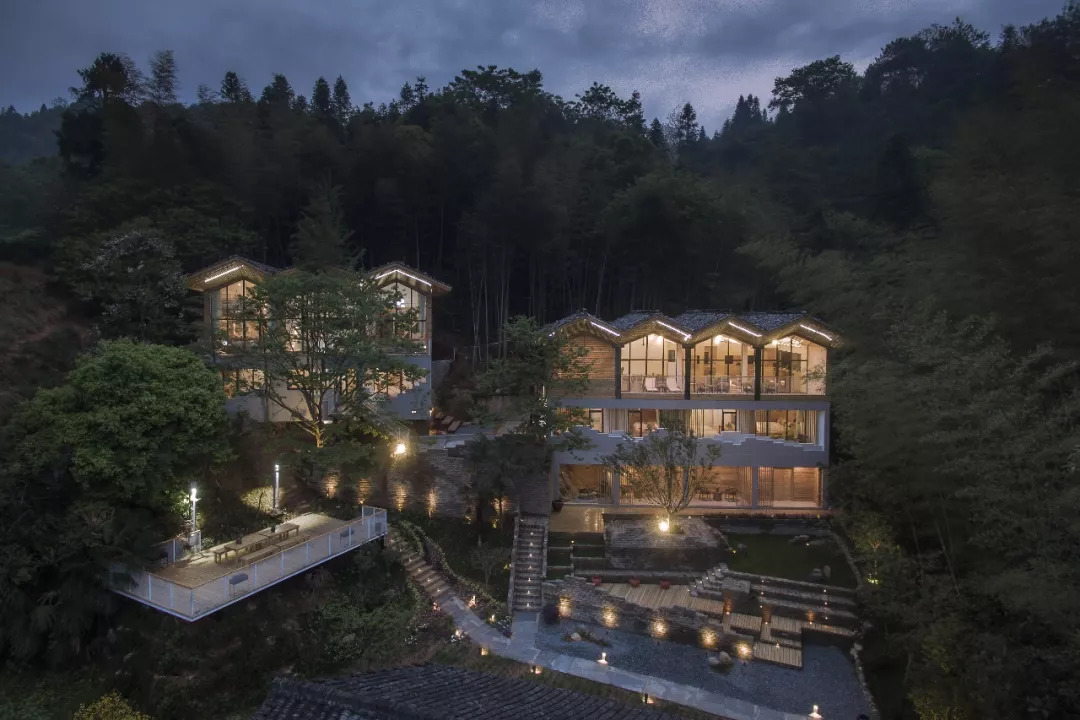 而亭云和素月则建在半山腰上,是新建的。但同时我们保留了场地上两棵银杏树,让它们从房子中间穿越而出。