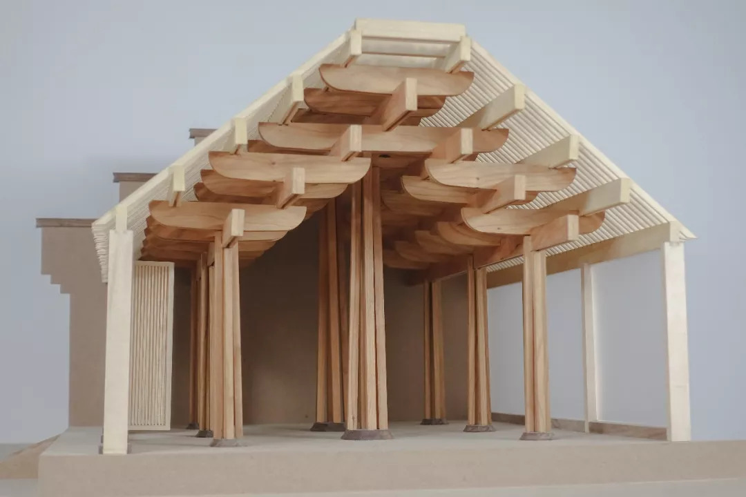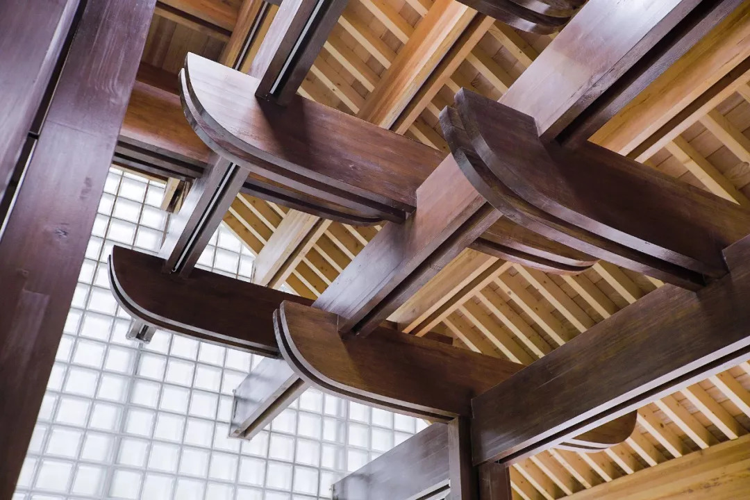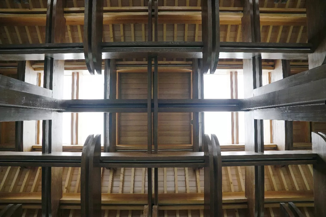 所有梁和柱通过榫卯的方式咬合在一起,形成了“散柱复梁”的屋架体系,没使用一根钉子。