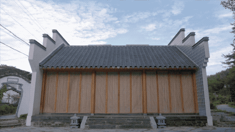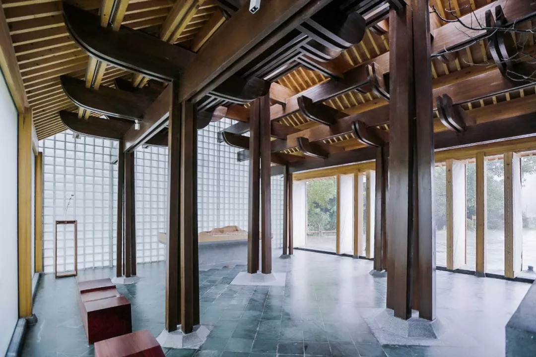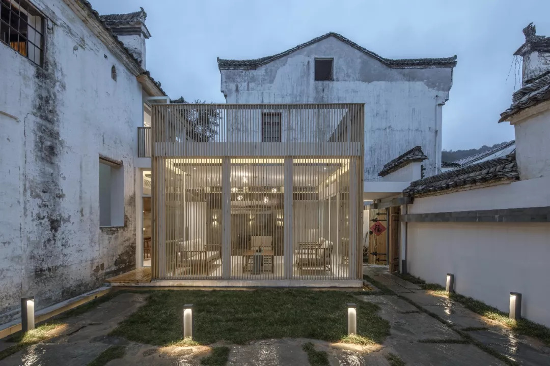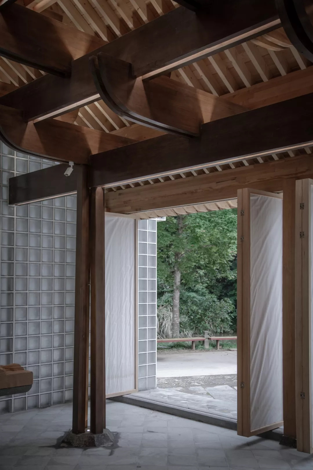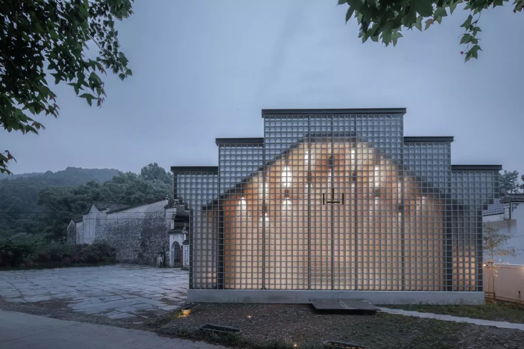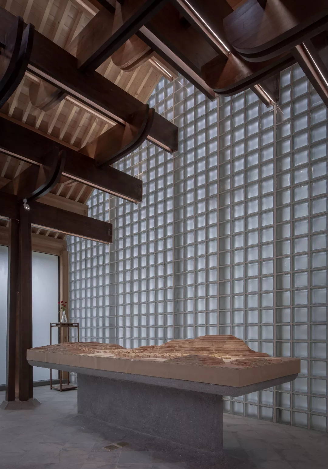 用3000块玻璃砖砌了一整面马头墙,一改传统马头墙的封闭感,里面木结构的虚影呈现在外部。