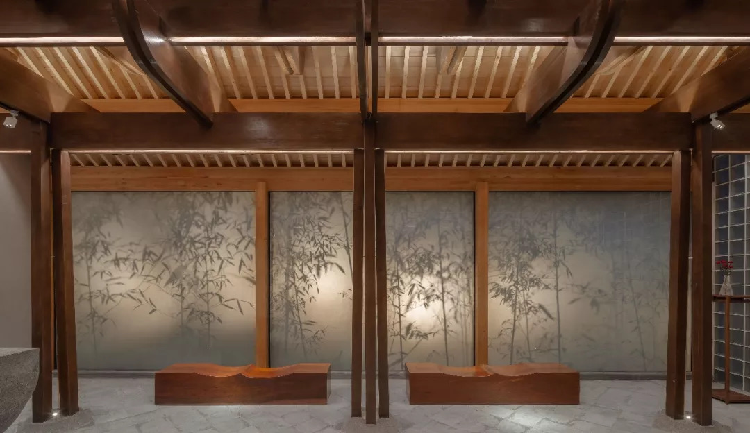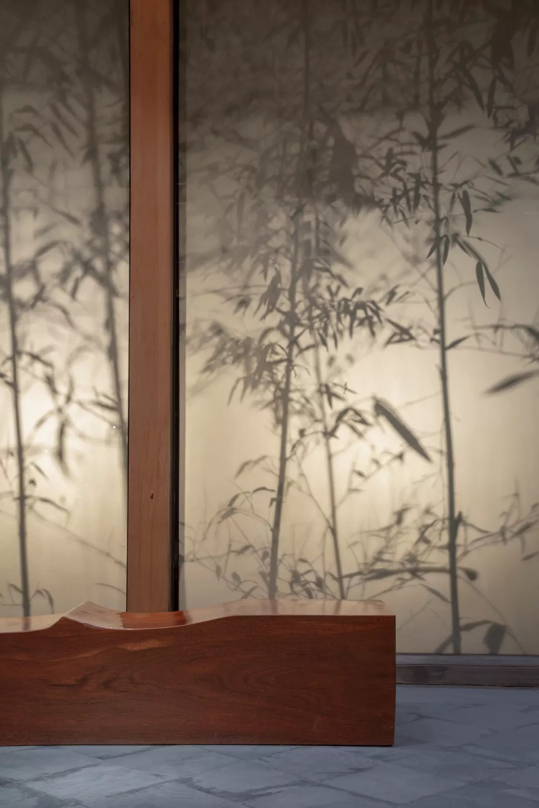 我们把生长在外部的竹子,通过光影的方式投射到这面半虚的玻璃墙壁上。竹影婆娑,随风摇曳,充满整个室内。