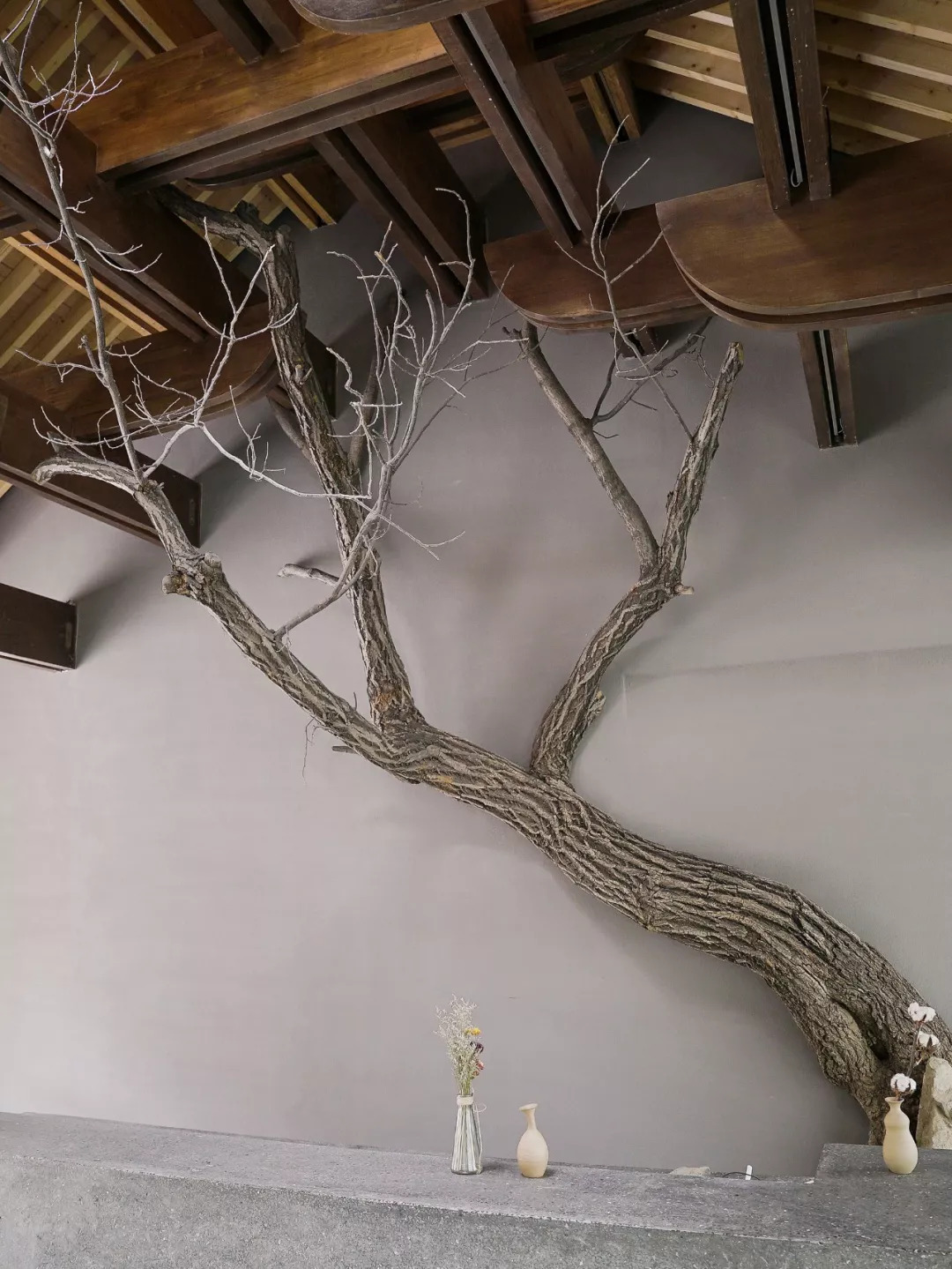 我们专门从800公里以外的苗圃园中,挑选了一棵弯曲的枣树,砍下、运回,未经修饰,挂于墙壁之上。