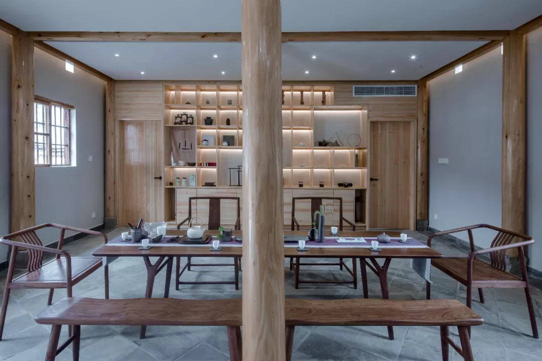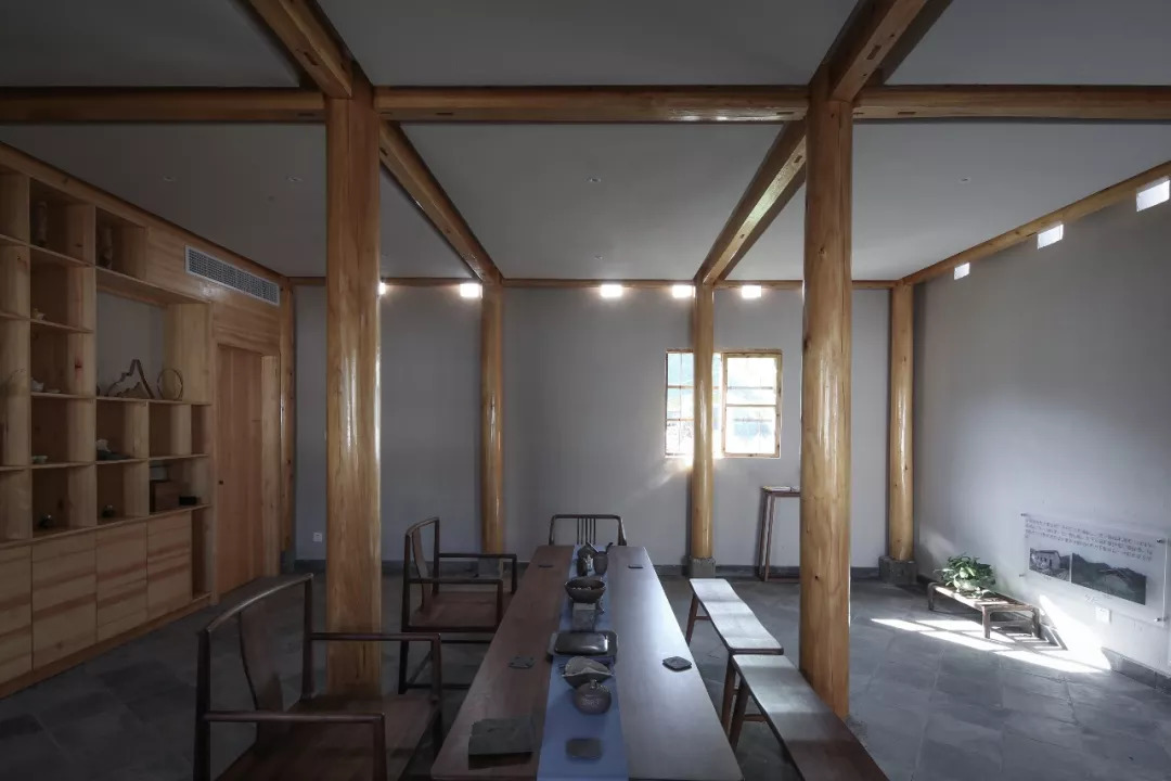 室内的整个木构体系重新设计。跟很多现代建筑不同,这间屋里梁和柱不再隐藏在墙体背后,而是显露在外,构成整个空间的骨架,也更有气韵。