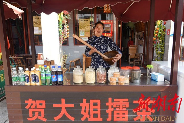 寻着古色古香的红墙绿瓦,走进长沙县浔龙河生态艺术小镇好呷街,有一家擂茶馆顾客盈门。每逢周末,常有全家老小驾着私家车来到这里。擂茶馆的主人贺彩珍,今年50岁,是安化擂茶能手。近3年来,因为对家乡“特产”的热爱,她从一名普通农村妇女,摇身一变成小有名气的擂茶馆老板。