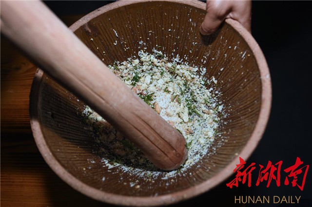 茶叶是自家栽种所产,大米、花生要泡上3、4个小时,姜必须挑选带泥土的……除了新鲜的原材料,在安化,擂茶的制作过程也全部要求纯手工,保证原汁原味。如今,换成浔龙河的米、浔龙河的水,贺彩珍坚持相同的做工,让更多人品尝记忆里的家乡味道。