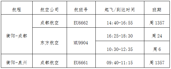 据了解,衡阳南岳机场以2018年冬春航班换季为契机,紧密对接各大航空公司。经过为期2个月的商洽和协调,最终促成衡阳直飞成都航线的稳妥落地。本次新开通的成都航班由成都航空和东方航空两家公司共同执飞,其中,成都航空公司执飞成都-衡阳-泉州航线,班期为每周一、三、五、七;东方航空公司执飞成都-衡阳航线,班期为每周二、四、六。