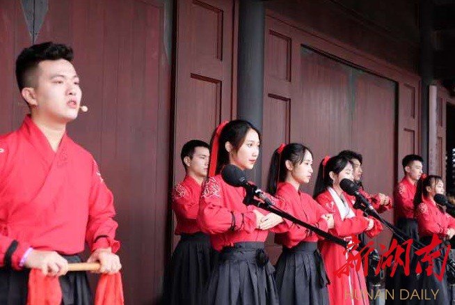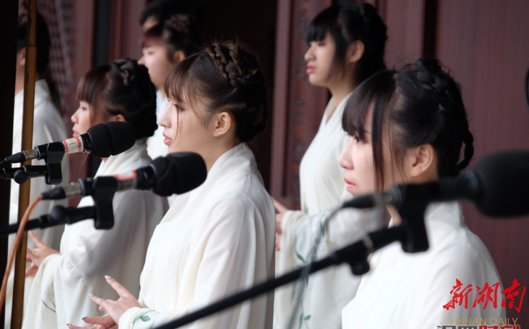 端庄多彩的汉服,随风飞扬的头饰飘带,悠扬动听的的背景古乐,极富古韵情思的经典诗词,给观众奉献了一道传统文化盛宴。“我很喜欢古诗词,之前参加过龙舟赛里的吟唱表演。今天听哥哥姐姐们空灵动人的古诗词吟唱,让我学到很多。”汨罗市归义中学九年级学生霍萌兴奋地说。