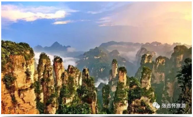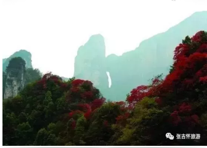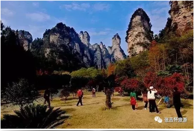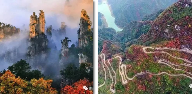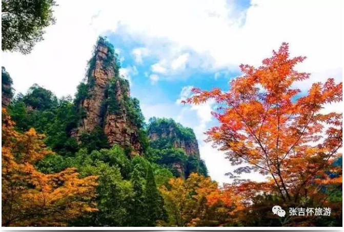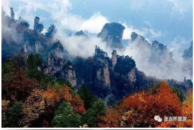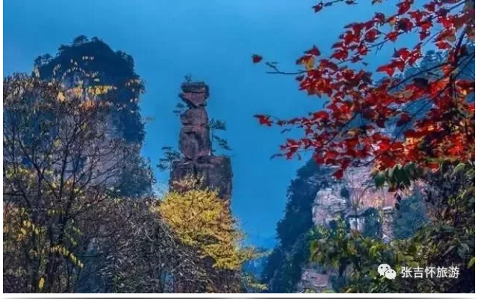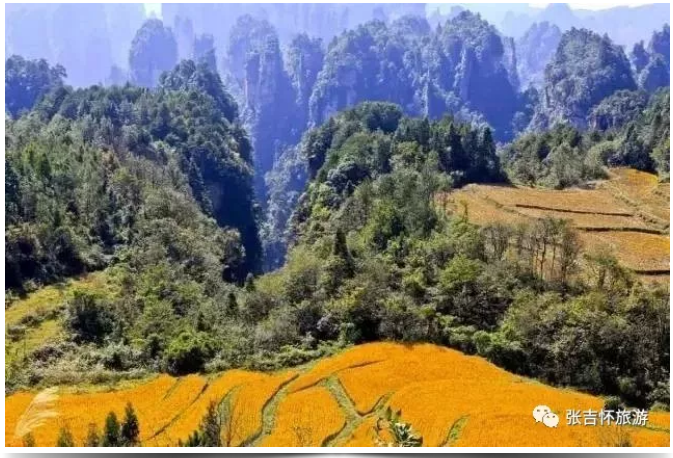 秋天的张家界,五颜六色的满山树木把天子山、袁家界、黄石寨、杨家界等景区的一座座石峰装扮得风情万种,峰林之巅不断变红变黄的树叶和丰收在望的田园风光,夹杂着游客不断惊叹的赞美!