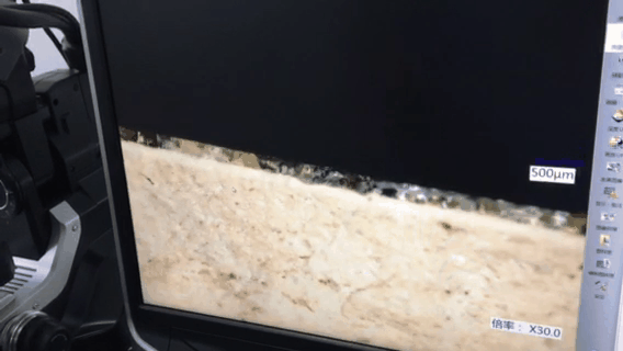 (高精度显微镜下的长沙窑瓷片。瓷片表面的未融铁彩颗粒浮于釉面之上。)
