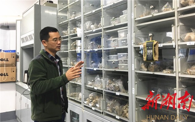 (副研究员莫林恒正在介绍老司城遗址出土动物骨骼遗迹。)