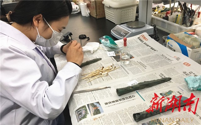 “憋死我了憋死我了。”青铜器修复室内,青铜修复技师丁洁小心翼翼地用小镊子贴上了一块青铜戈的碎渣,才敢对着空地呼吸。“有的青铜脱落物真是太小了,呼吸会把它们吹跑的。”双手托着这块宁乡出土,已经残缺不堪的战国武器,丁洁轻声介绍。