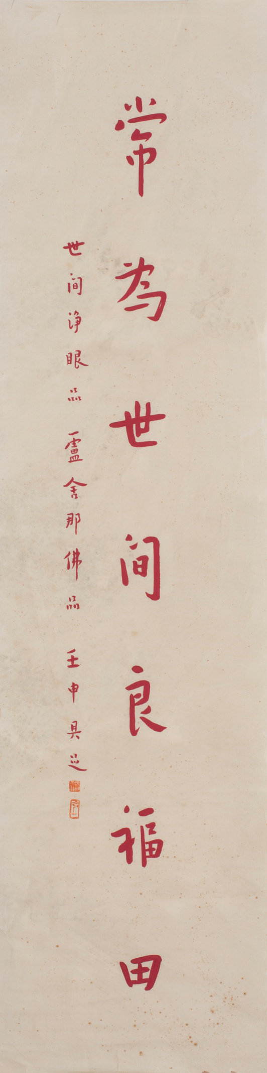 题识:能立无上正教法,常为世间良福田。晋泽大方广佛,华严经偈颂集句。世间净眼品,卢舍那佛品,壬申、贝足
