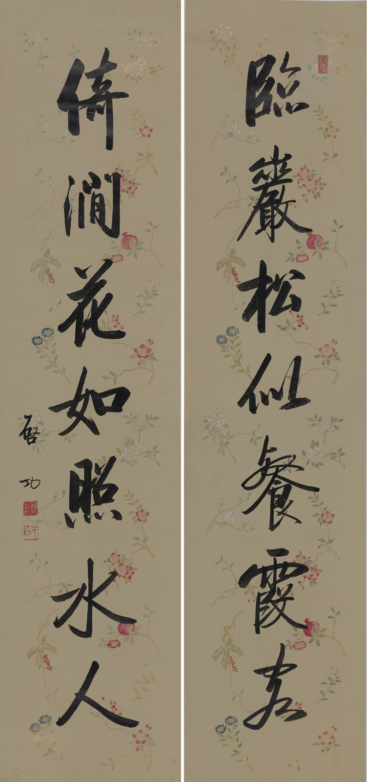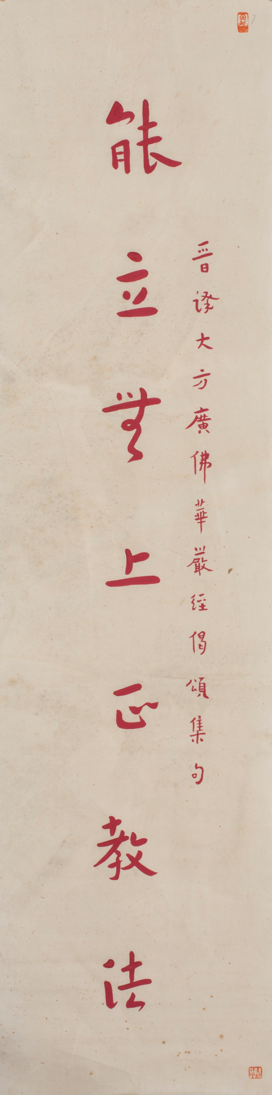 “庄严,肃穆,安静,本分”——基本就能概括弘一法师书法的面貌。此次上拍的书法对联用纸上乘,选上等朱砂书写,色泽随书写下笔轻重而显现丰富的朱色层次。他的书法“朴拙圆满,浑若天成”,连鲁迅、郭沫若等文化名人皆以得到他的手泽为无上荣耀。像这件来源有序、选料上乘、传世量极少的朱笔作品,在弘一法师的作品中堪称珍贵。