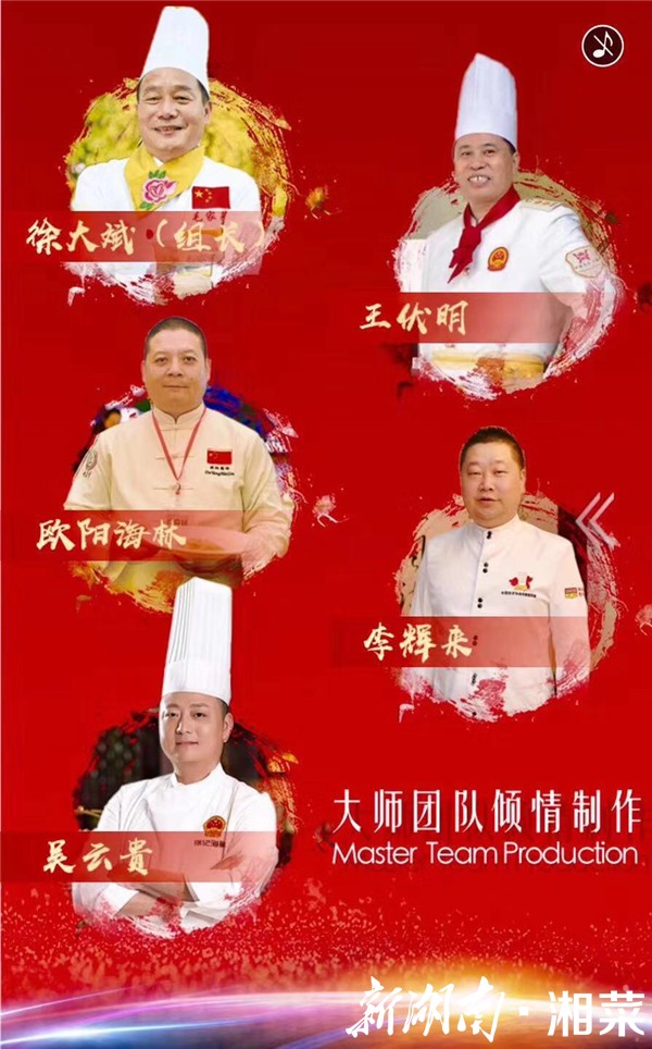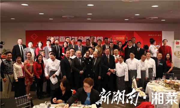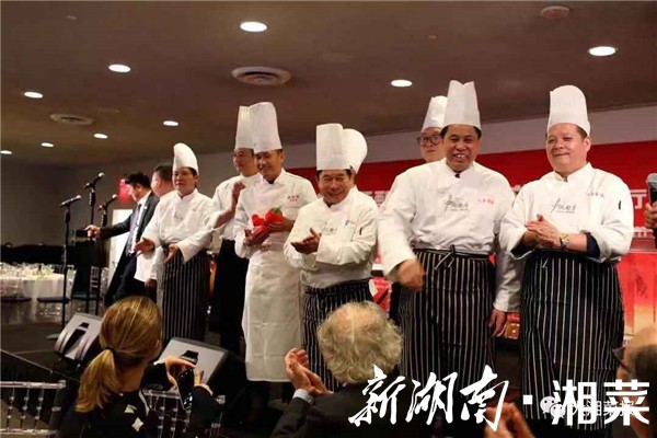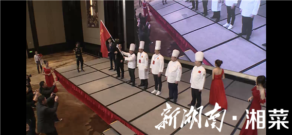 时间回到2018年1月11日晚,长沙瑞吉酒店宴会厅,来自全国乃至全世界的600余湘菜人欢聚一堂,参加由湖南省商务厅、湖南省贸促会、湖南日报社主办,大湘菜报、湖南省餐饮行业协会、湖南省湘菜产业促进会承办的"2017湘菜年度盛典",在异彩纷呈的系列活动中,有一项特别引人瞩目,随着主持人宣布“湘菜香飘联合国”出征仪式开始时,省委宣传部副部长杨金鸢为"湘菜飘香联合国"大师团队授旗,湘菜大师徐大斌代表出征团接旗,王伏明大师代表出征团宣誓,出征团大师加上我、吴云贵、李辉来共五位代表在舞台上亮相,吹响了湘菜进军联合国的号角。