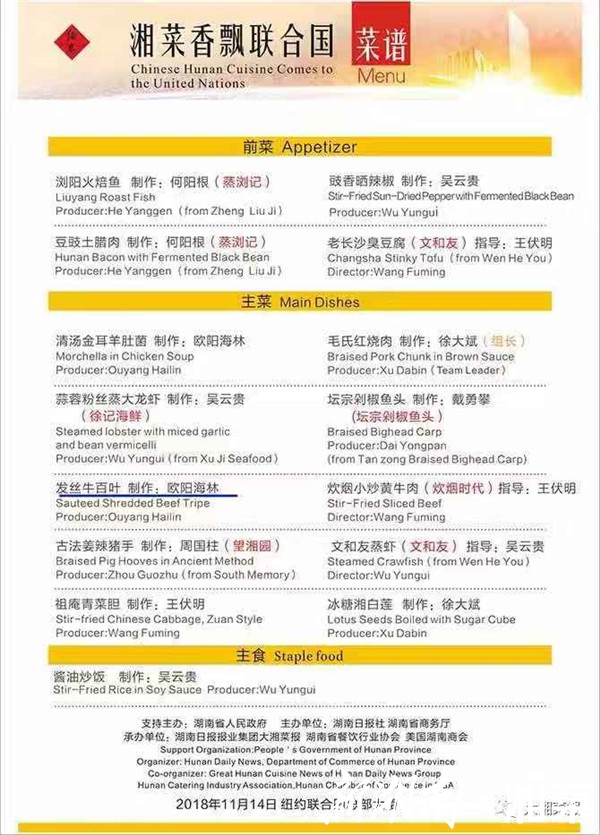说实话,我当时对这个事情是抱有怀疑态度的,湘菜能进联合国?可能吗?后来一想,反正也就在舞台亮下相,又不损失什么,无所谓,于是便不远千里赴长沙参加了出征仪式,结束后,也没把这件事放在心上,回去继续干自己该干的事去了。期间大湘菜报陈胜年社长也很长一段时间没有与我联系,就以为这件事就此落下了。