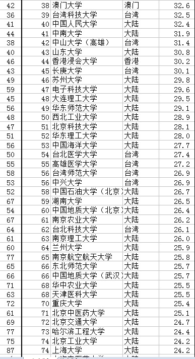 与去年相比,大陆高校中,华南理工大学、电子科技大学、华东师范大学、湖南大学、南京航空航天大学、上海大学、云南大学、河海大学今年均有显著提升,展示了大陆高校强劲的发展势头。上海中医药大学与首都师范大学首次入榜百强高校,今年分别排在74位与93位。台湾高校中,排名靠前的高校表现稳定,而相对靠后的高校总体有下降的趋势。香港上榜的6所高校均位列50名以内,其中5所高校位列前20名。具体来看,香港大学相较于去年下降2位,香港中文大学与香港科技大学与去年持平,其余三所则均有不同幅度的提升。澳门地区上榜的2所高校均位列前40名,其中澳门科技大学从去年的28位上升到今年的21位,澳门大学上升4位排在38位。