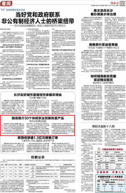 湖南日报·新湖南客户端11月3日讯(记者 欧阳倩 金慧)今天上午,在第十六届中国国际农产品交易会暨第二十届中国中部(湖南)农业博览会系列活动中,我省推介了50个休闲农业创新创意产品,发布了20条休闲农业与乡村旅游精品线路。