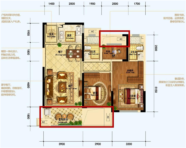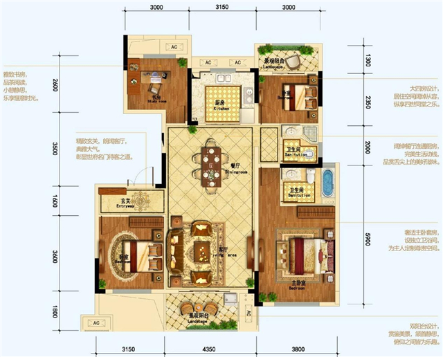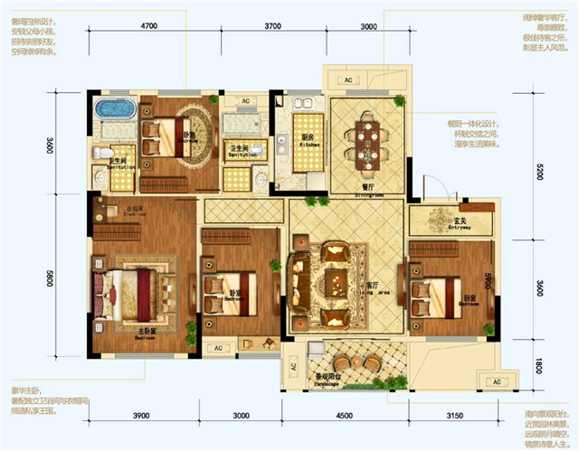 ①约3.9米-4.5米客厅开间,南向卧室开间的大面宽,保证休闲娱乐与休息空间同样舒适;②豪华主卧均配备独立卫浴,方寸之间尽显尊崇;③餐客一体的设计,延展更多空间,轩阔明朗大格局,安放一家人的理想生活。