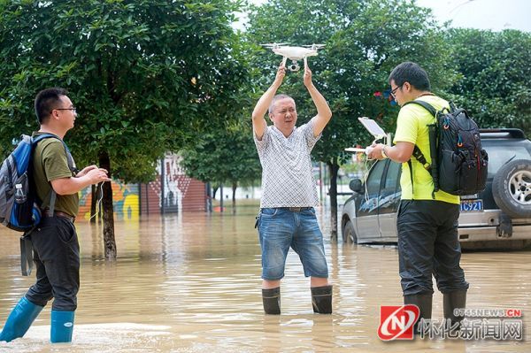 怀化日报社的记者,在洪水中利用无人机查看被困群众、营救被困群众,展现记者的担当精神。(资料照片)