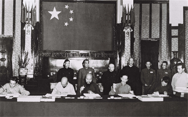 (1951年5月23日,原西藏地方政府全权代表阿沛·阿旺晋美、凯墨·索安旺堆、土丹旦达、土登列门和桑颇·登增顿珠与中央人民政府全权代表李维汉、张经武、张国华、孙志远在北京签订《关于和平解放西藏办法的协议》。朱德副主席、李济深副主席、陈毅副总理出席签字仪式。)