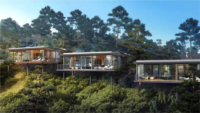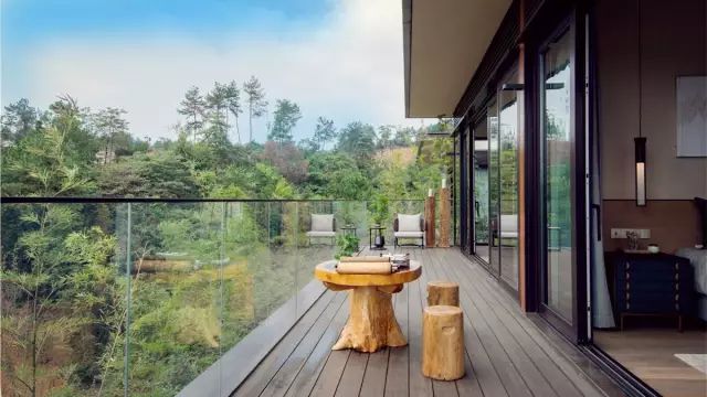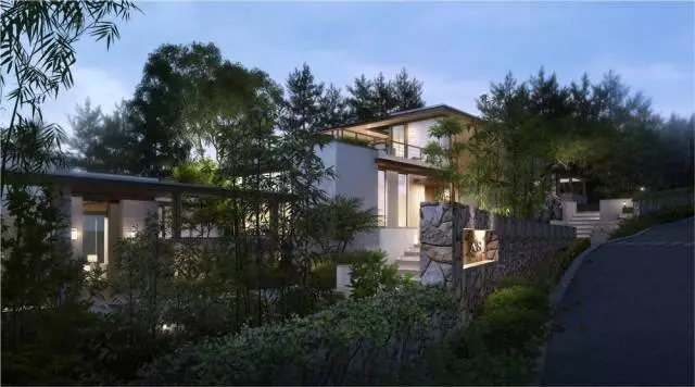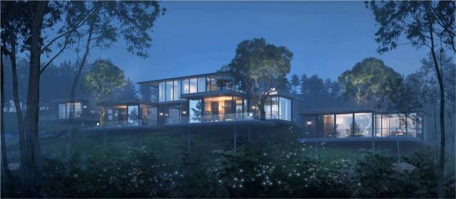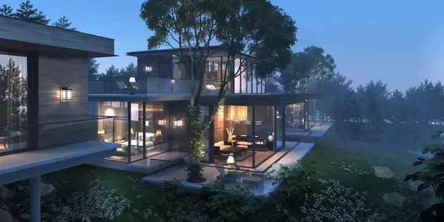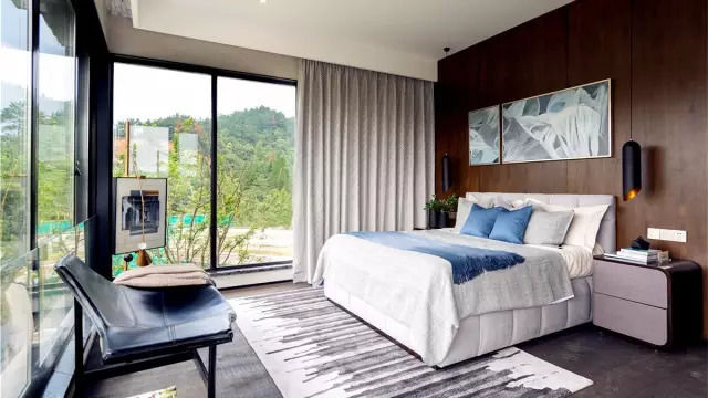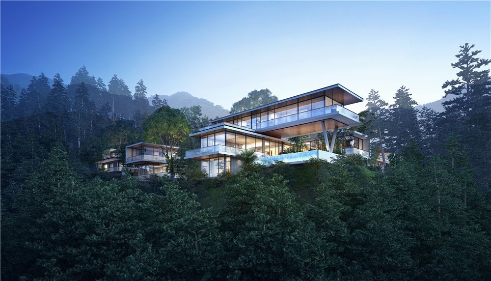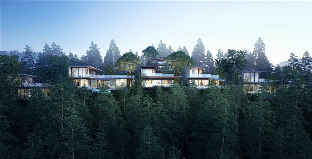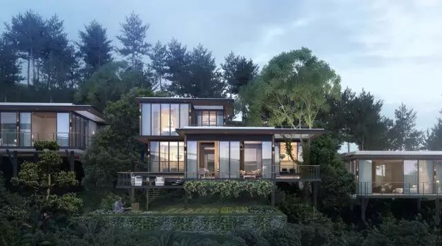 这56栋从三山两谷间长出的建筑,在完整保留原生山水的基础上,突破传统别墅的建筑形态,用大面积玻璃窗代替传统门窗,最大限度将外部自然景观引进室内。