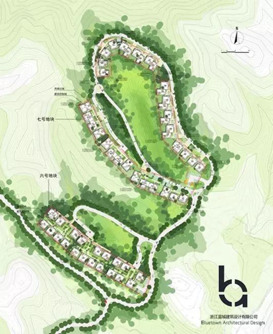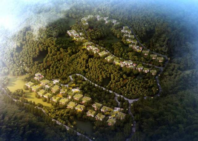 海拔100米,高差达41米的山脊上,56幢山墅依山而建