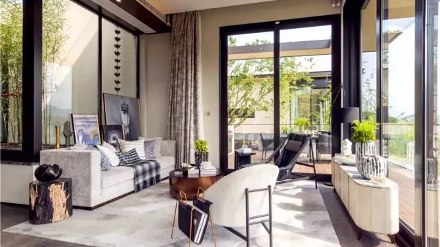 中庭南侧是拥有7.2米超大开间景观视野的一体化餐客厅,南向面宽达到14.4米,如此奢侈的面宽很大程度上得益于该组团超低的容积率。餐客厅一步可达30㎡以上的户外主露台。