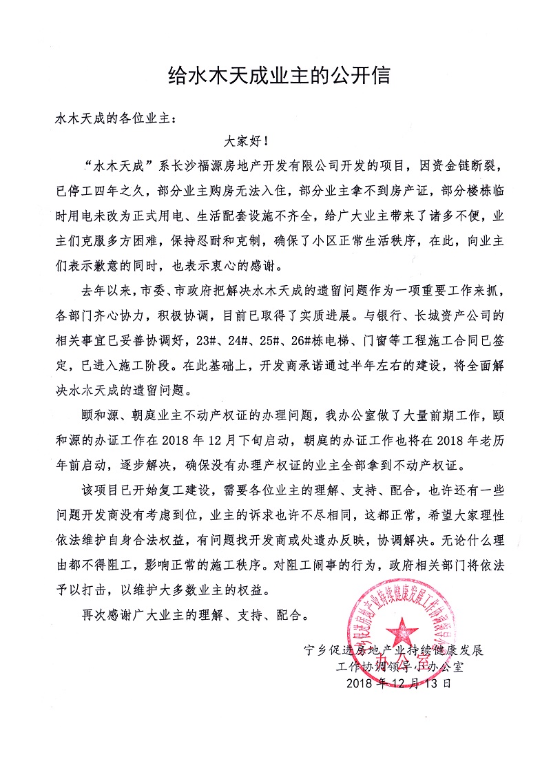 据悉,为解决、处理包括水木天成·朝庭在内的房地产遗留问题,2017年8月,宁乡市委、市政府成立了“宁乡促进房地产业持续健康发展工作协调领导小组”,当即于2018年10月20日对水木天成·朝庭的问题作出批示,要求各部门必须高度重视,处遗办需全力做好前期协调工作,确保在2018年底前启动复工建设,尽快交房。