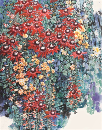 第三个特点是讴歌大美,谱写群芳。柯桐枝画中的花,很多是奇花异卉,他自己也叫不出名字,有时还会把不同地域不同季节的花卉画在一起,画心中的第二自然,画花鸟的梦想。但不管如何,仍然有两个特点,一个是花头大,有意的夸大。另一个特点以群体意识描绘花木,画成片的花,画花的群体,花的海洋,众花的争妍怒放。