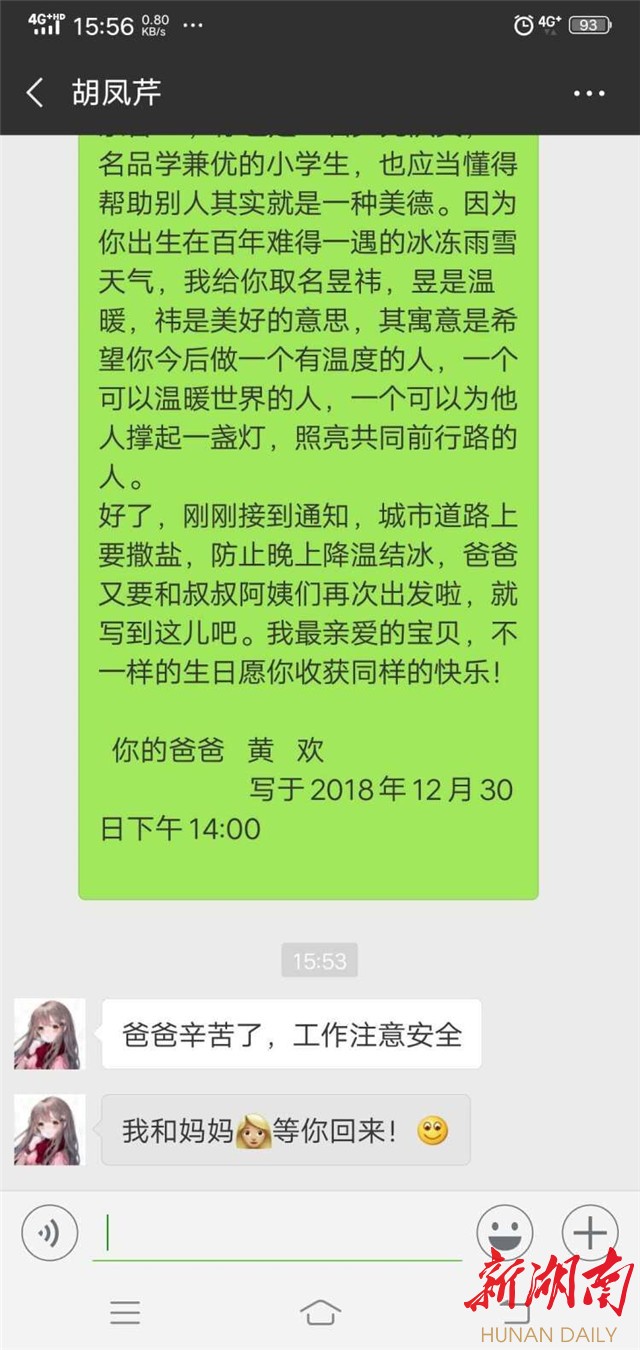 背景:今天是长沙市雨花区市政局工作人员黄欢女儿的生日。由于工作所需,黄欢清晨5时出门参加铲雪除冰抢险工作。午饭后间歇,黄欢写下这封信,聊以抒发对女儿的爱意与愧意。