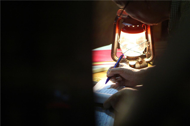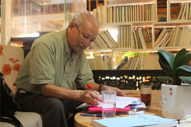 之后的五个小时里,我们在大厅整理、擦拭着他的书籍,他一直坐在那里,没有起过一次身,喝过一口水。吴先生的注意力一直在字里行间,眼睛始终在红蓝黑的字迹之间疾驰。他似乎已经隔绝了时间,抛弃了时间,置身于自己构建的文字丛林中,思想游走,斩除劣根。只有偶尔响起的轻微咳嗽声,告诉我们他的存在。而我们也不敢打扰老师,只是在夜色降临时,悄悄上前在办公桌前放了一盏马蹄灯,以期他在丛林深处有光相伴。
