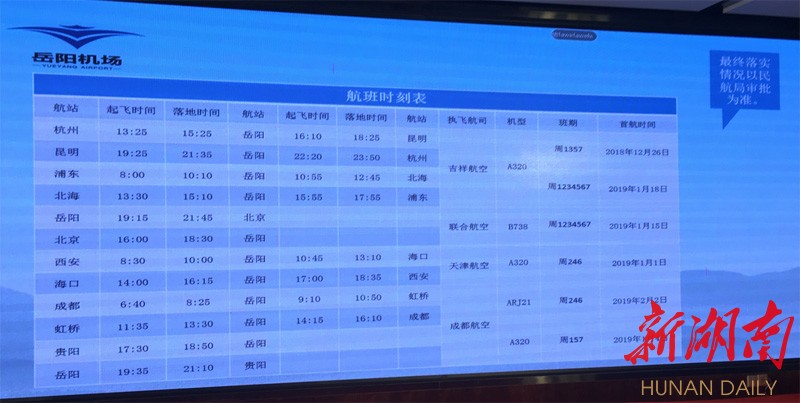 机场负责人介绍,首航开通杭州-岳阳-昆明(周1、3、5、7)航班, 2019年元旦后,将陆续推出西安-岳阳-海口,上海浦东-岳阳-北海,岳阳-贵阳,成都-岳阳-上海虹桥,岳阳-北京等10条航线,每周进港航班合计约88班次,预计2019年将实现旅客吞吐量30万人次。