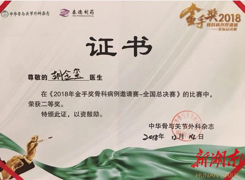 湖南日报·新湖南客户端12月18日讯(记者 徐亚平 通讯员 王丹青)今天,记者从岳阳市二人民医院获悉,在刚刚闭幕的2018年“金手奖”骨科病例邀请赛全国总决赛上,该院骨二科胡金玺医师荣获创伤专场全国总决赛二等奖。这是全国地市级医院在该专业的唯一大奖,也是近年来岳阳骨科团队在该赛事获得的最高奖项。