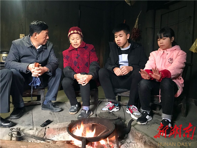 我们到达向广林家时,广林家火塘里火烧得正旺,这栋山林深处的木屋里,火光熠熠,树枝在火塘里快乐地燃烧着,发出轻微的爆裂声。湘西州人大常委会主任、州慈善总会会长彭武长,湘西州民政局副局长、州慈善总会秘书长罗贤兵,湘西州慈爱园园长张薇等一行人正围坐在向广林家中的火塘边,与小广林的奶奶交谈。