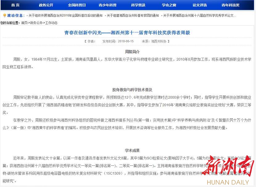 新湖南客户端12月14日讯(通讯员 刘湘蓉)近日,湘西土家族苗族自治州州委组织部、州人力资源和社会保障局、州科学技术协会联合开展了第十一届湘西自治州青年科技奖评选活动。经严格审核评选,共表彰为湘西州经济建设、社会发展做出突出贡献的优秀青年科技工作者12名,湘西职业技术学院生物工程系有2名青年专任教师喜获殊荣,周毅为其中之一。