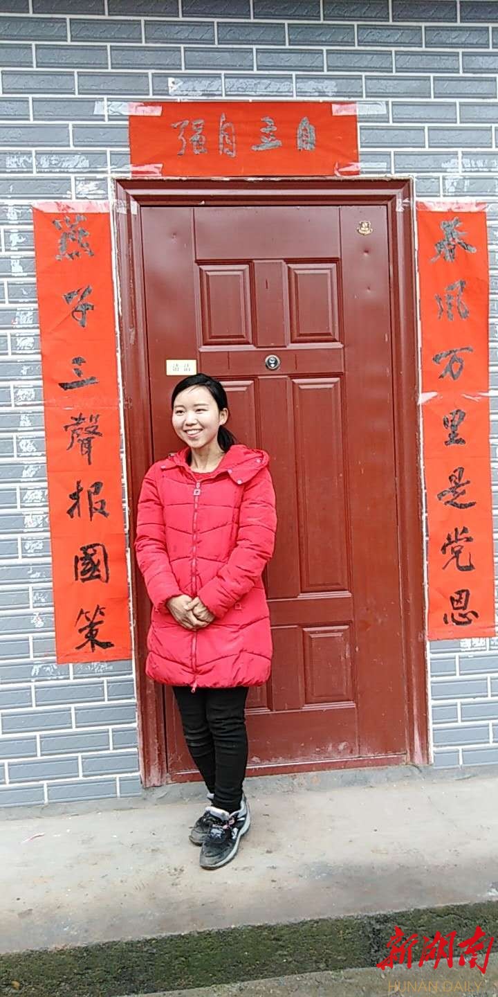 对联为“燕子三声报国策 春风万里是党恩”,嵌了名字,词义合心。胡春燕高兴地掏出手机,把自己站在春联前乐滋滋的照片,发到微博、微信上。