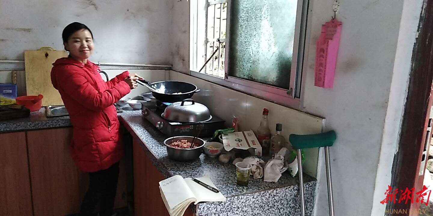 1月20日上午,记者来到沅陵县明溪口镇胡家村胡春燕家,她正在自家厨房里做油炸干鱼。热油“嗞嗞”响,她用锅铲不停翻,生怕烧焦。有灶台倚靠,她把拐杖放在进门处。
