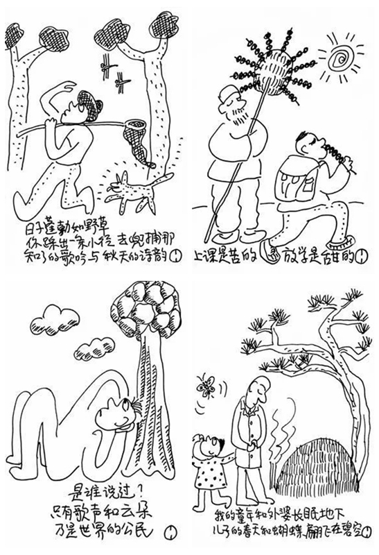 以往最好的漫画当属丰子恺的作品,他带着传统的纯情之爱走进古典的追寻,为人的前途画一幅回归童真的方向。何立伟呢,却是带着现代的孤哀走去作这古典的追寻,望见并感动于那些童真的背影都已变得冰凉,于是便为人的前途改换了一个方向。这真是继承和发展吧,正如孩子必要长大,童真无计久留,于是在丰子恺先生走后漫画界空旷多年,终于等来了何立伟。