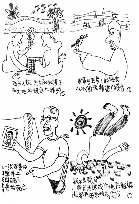 史铁生兄生前最后一本随笔集《病隙碎笔》,出版社要给他的文本配插图,他托陈村找到我,一定要请我来画。铁生真是让我感动。1993年江苏文艺出版社出版我的漫画集《星光失眠》时,铁生给我写了同样让我感动的“跋”,他写下了这样的话: