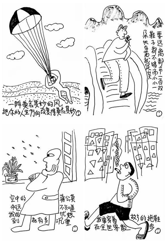 而且纯粹是在写作之余,忽然想起来什么,顺手就涂抹下来,几根歪歪扭扭的线条,一句没头没脑的呓语,构成了一种所谓文人漫画的图式。