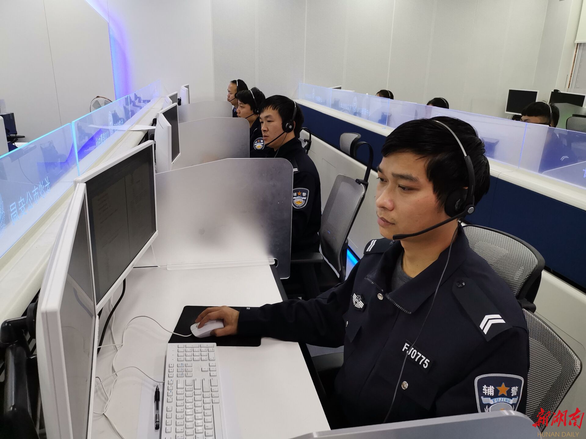 接警员张颖轩正在仔细询问报警人。1分钟前,有人报警称电动车被盗。张颖轩飞速地敲打着键盘,20秒后,他向离报案人最近的星城快警平台派警,要求其前往现场处置。