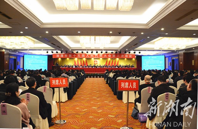 14时30分,湘潭市十五届人大三次会议举行第四次全体会议。大会主席团常务主席、本次会议执行主席曹炯芳、谈文胜、何俊峰、李江南、杨广、陈忠红、胡卫兵、廖桂生、吴小月、杨真平、戴德清、刘新文、刘建业、颜集成、潘爱民、彭子玉、阳建民、徐亚健、肖树人、韩晓在主席台前排就座。会议由李江南主持。