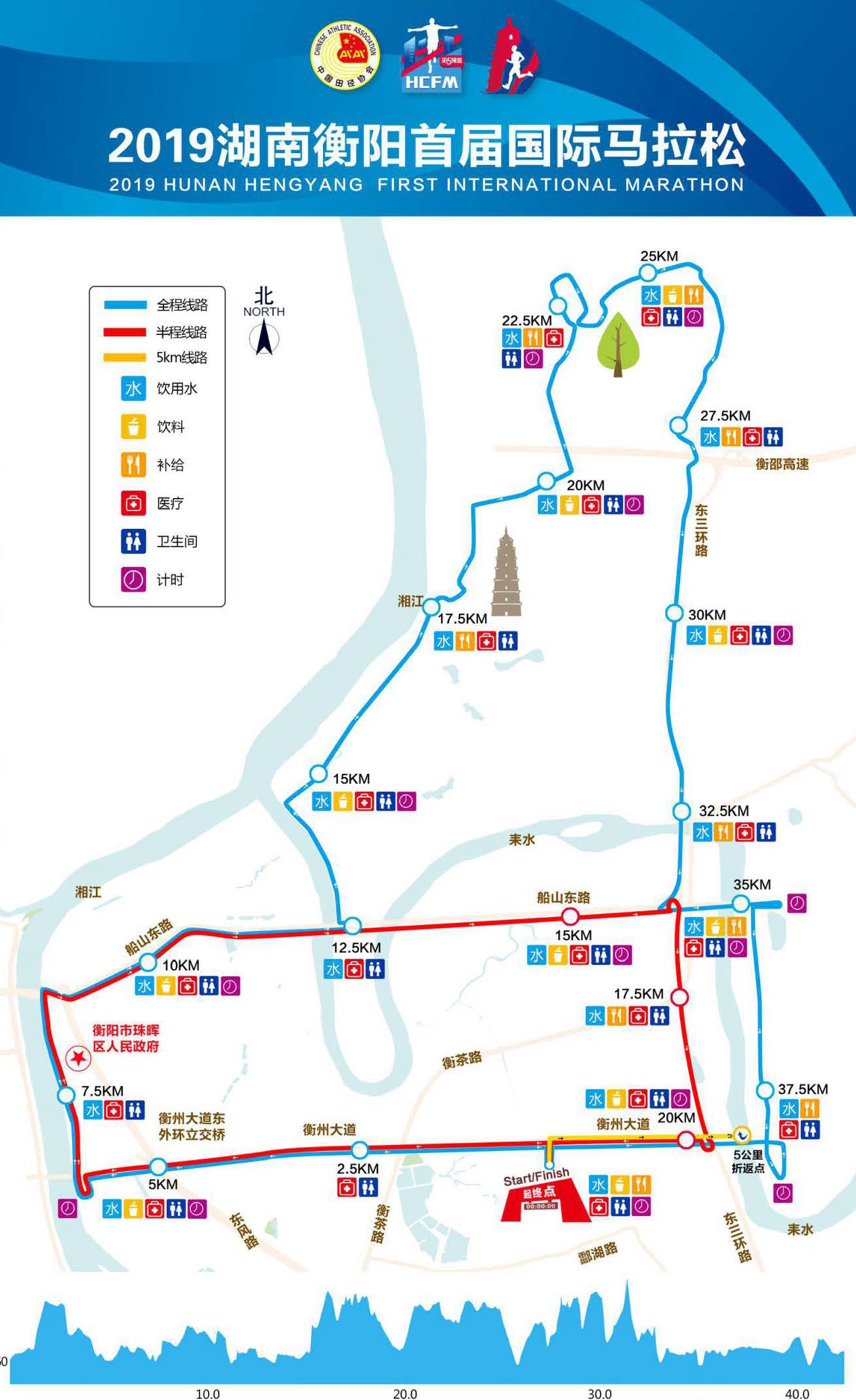 全程马拉松(42.195公里)线路:衡阳市体育中心(起点)→衡州大道(向西逆行)→湘江公铁大桥匝道→湘江东路→船山东路匝道(逆行)→船山东路(逆行)→耒水大桥东侧匝道→耒水北路(北)→湘江东岸新路→珠晖塔→009乡道→金甲岭路→金甲环形路→金甲梨园小镇→衡邵高速(穿过)→东三环路→酃茶大桥→东三环上船山东路匝道→船山东路(逆行)→滨江大道→衡州大道(逆行)→衡阳市体育中心(终点)