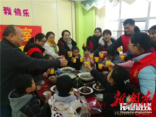 临近中午,社区工作人员已准备好丰盛的团年饭,猪蹄、牛肉、粉丝肉丸、鱼……四个钵炖得热气腾腾,十多个菜逐一上桌,杯里满上了大家爱喝的橙汁。社区党总支书记陈剑频特地和部分志愿者老师一起,陪孩子们一起吃团年饭。