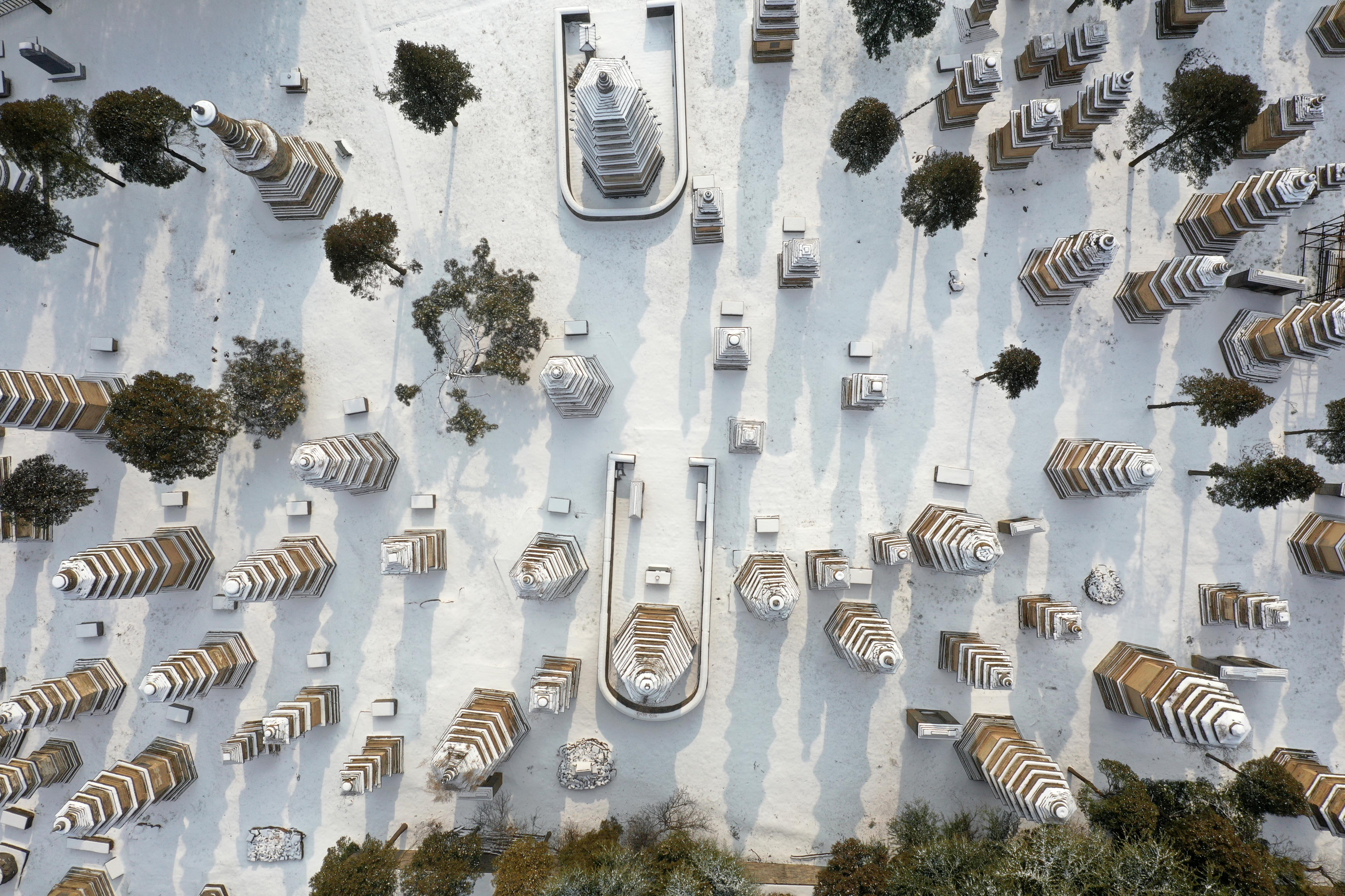 1月10日无人机拍摄的河南登封少林寺塔林雪景。新华社/冯大鹏