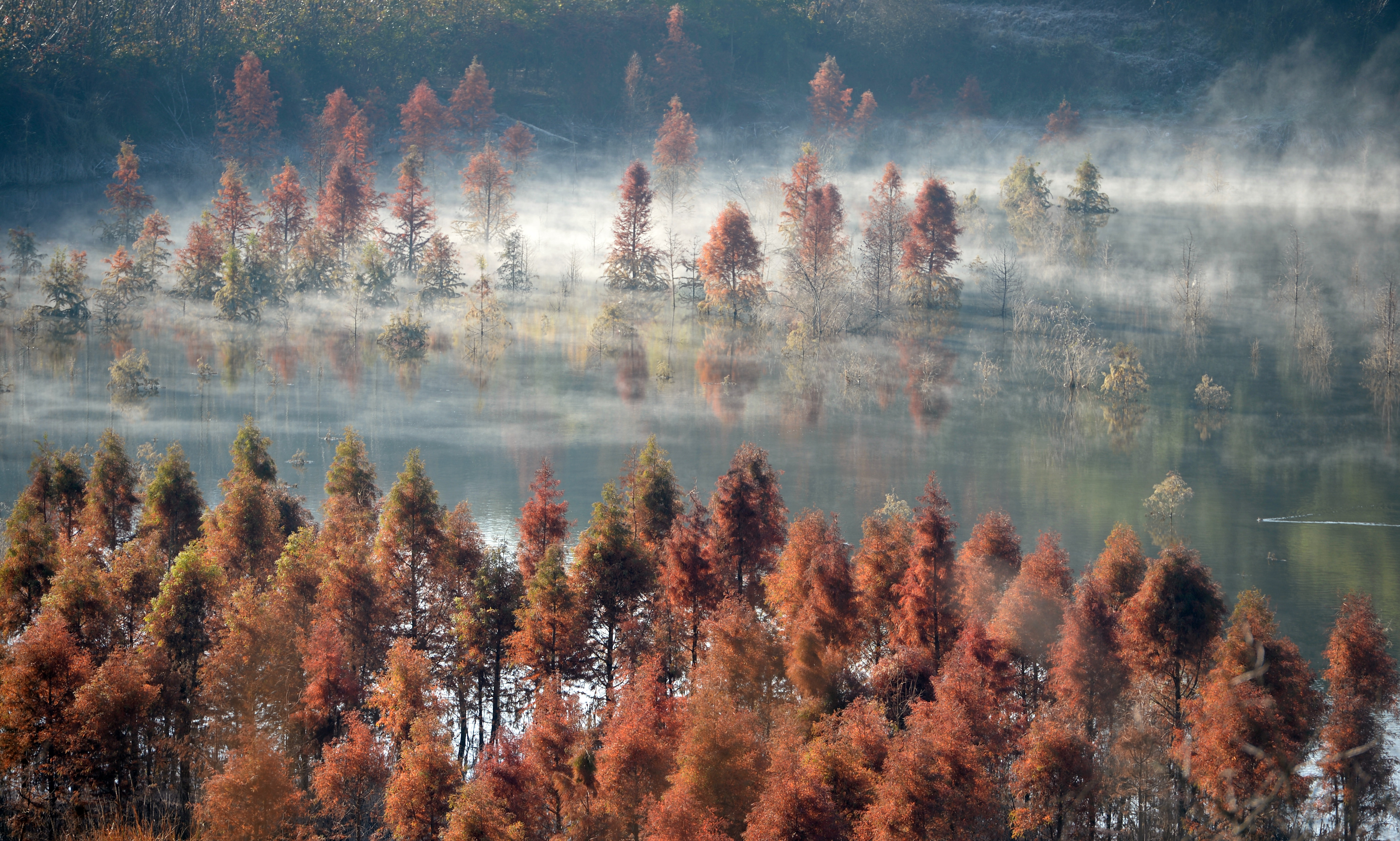 1月5日,水鸟游过清晨薄雾中的昆明市盘龙区滇源街道甸尾村水杉湿地。新华社/秦晴