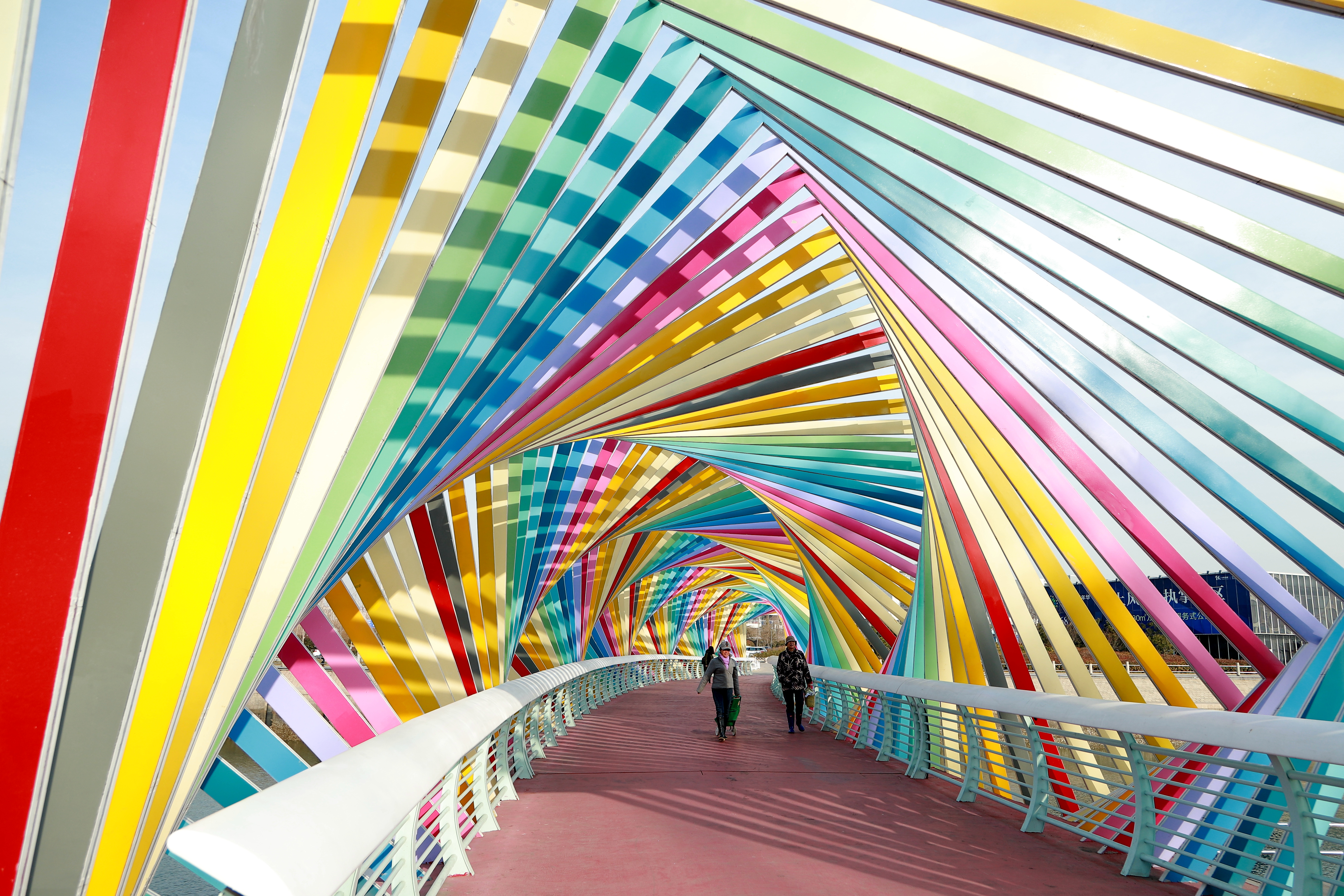 1月8日,市民从山东省青岛市西海岸新区唐岛湾公园西侧的“彩虹桥”上走过。新华社/王培珂