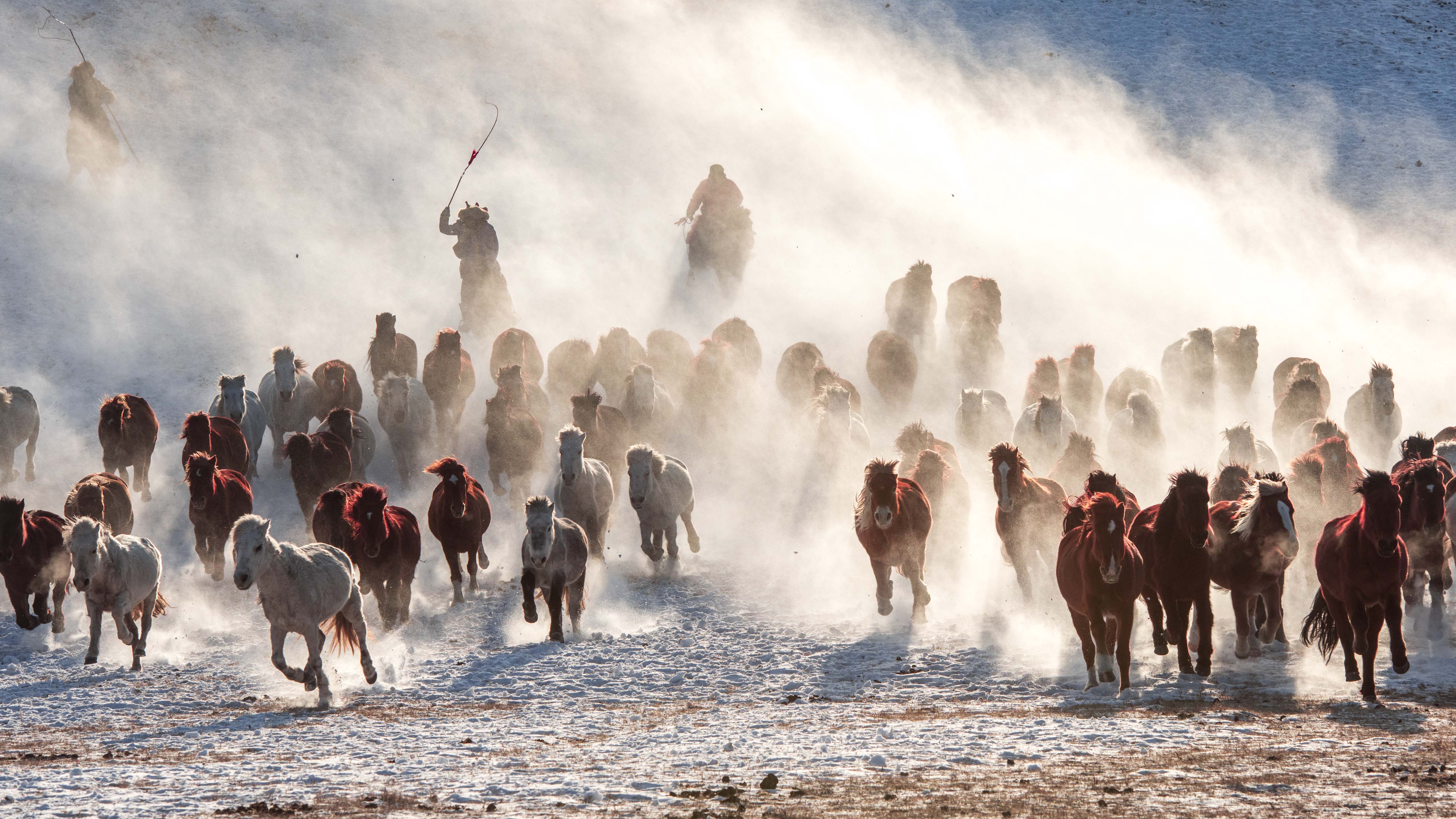 1月6日,内蒙古赤峰市克什克腾旗乌兰布统苏木牧民赶着马群为游客表演。新华社/孙国树