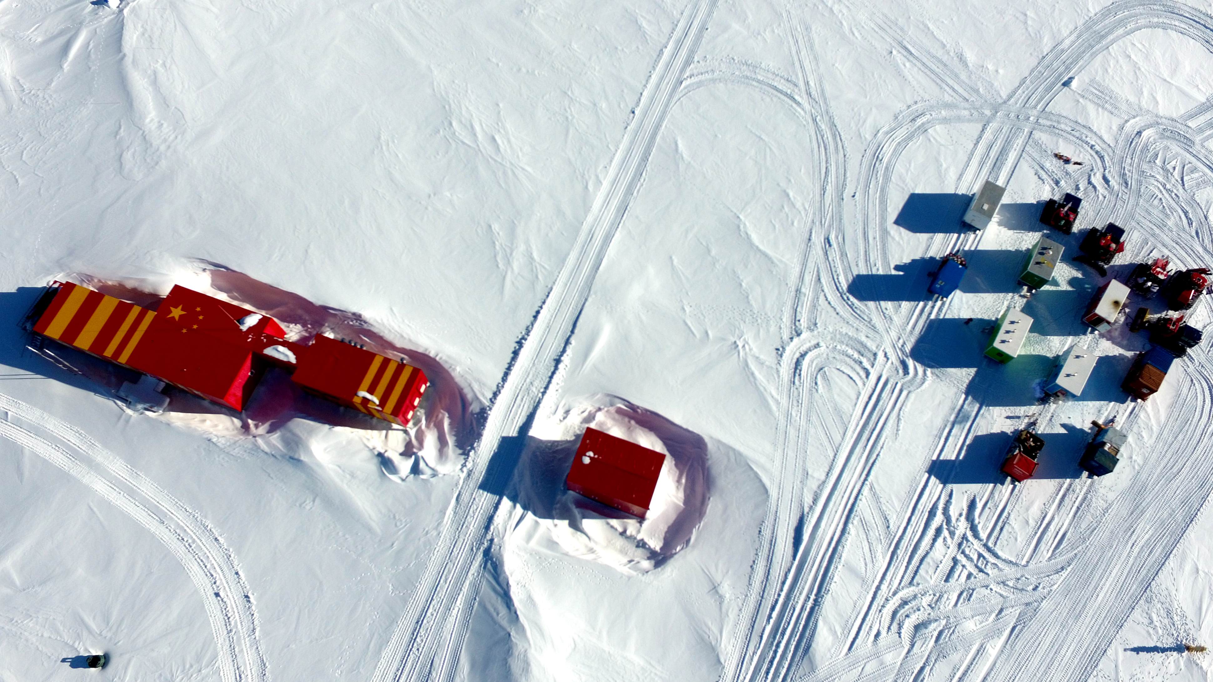1月4日,中国第35次南极科考队昆仑队抵达南极昆仑站主体建筑(无人机拍摄)。新华社/刘诗平