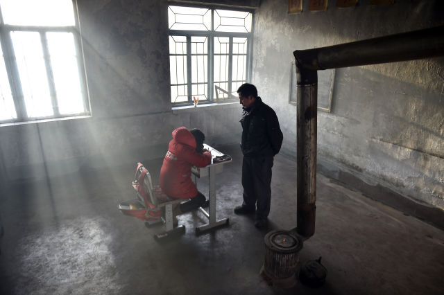 1月8日,在辽宁省铁岭市深山中的砚台小学,扈志生老师看着他唯一的学生——三年级的孙晓锋做题。地处铁岭开原莲花镇砚台村的砚台小学学生最多的时候曾有200多人,由于地处山区,越来越多的家庭把孩子带到山外面读书,或者转到镇上的中心校。到了2018年9月,学校便只剩下孙晓锋一个学生。新华社/姚剑锋